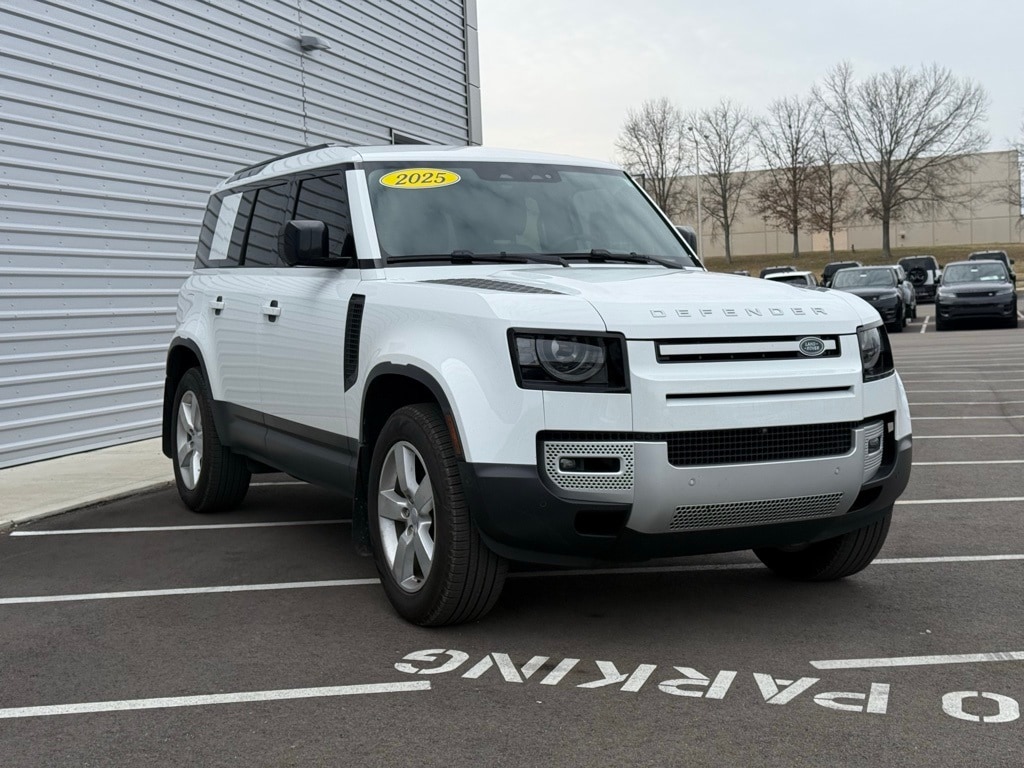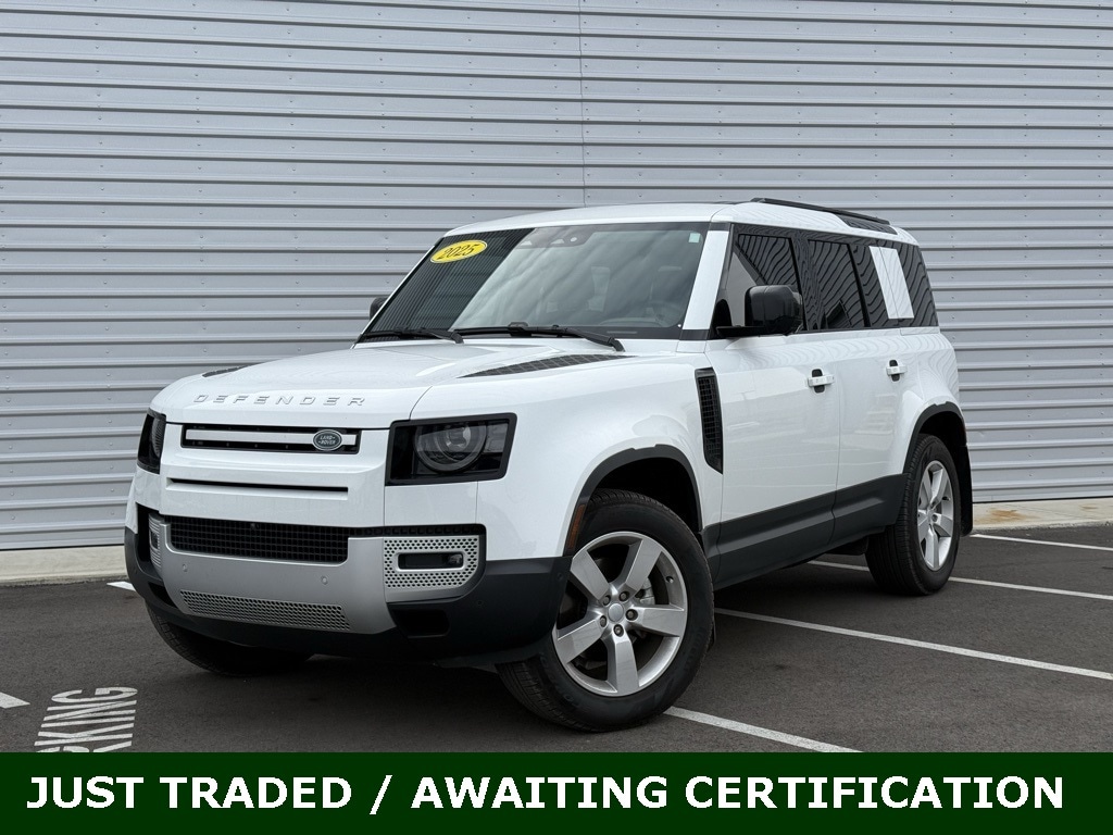 Certified. Fuji White 2025 Land Rover Defender 110 S AWD 8-Speed Automatic 2.0L I4 DI Turbocharged 4WD, Automatic Headlights, Backup Camera, BLIND SPOT MONITOR, BLUETOOTH/ HANDSFREE, HEATED SEATS, IPOD ADAPTER, Keyless Entry, Leather Seats, Multi-Zone Climate Control, NAVIGATION/GPS, NON SMOKER, PANORAMIC MOONROOF, PARKING SENSORS, REAR VIEW CAMERA/BACKUP CAMERA, RECENT FULL SERVICE, REMOTE START, SATELLITE RADIO/ SIRIUS XM, Steering Wheel Controls, SUNROOF/MOONROOF, TOW PACKAGE, Trailer Hitch, Collision Warning System, Auto Emergency Braking, Rear Cross Traffic Alert, 360 Degree Camera, Voice Recognition, Smartphone App Integration, Push Button Start, Touch Screen Controls, Audio Package, Climate Package, Driver Confidence Package, Luxury Package, Trailer Package, Defender 110 S, 4D Sport Utility, 2.0L I4 DI Turbocharged, 8-Speed Automatic, AWD, Fuji White, Khaki/Ebony w/Perforated Ultrafabrics Seat Trim, Navigation system: Connected Navigation PIVI Pro, Towing Pack.